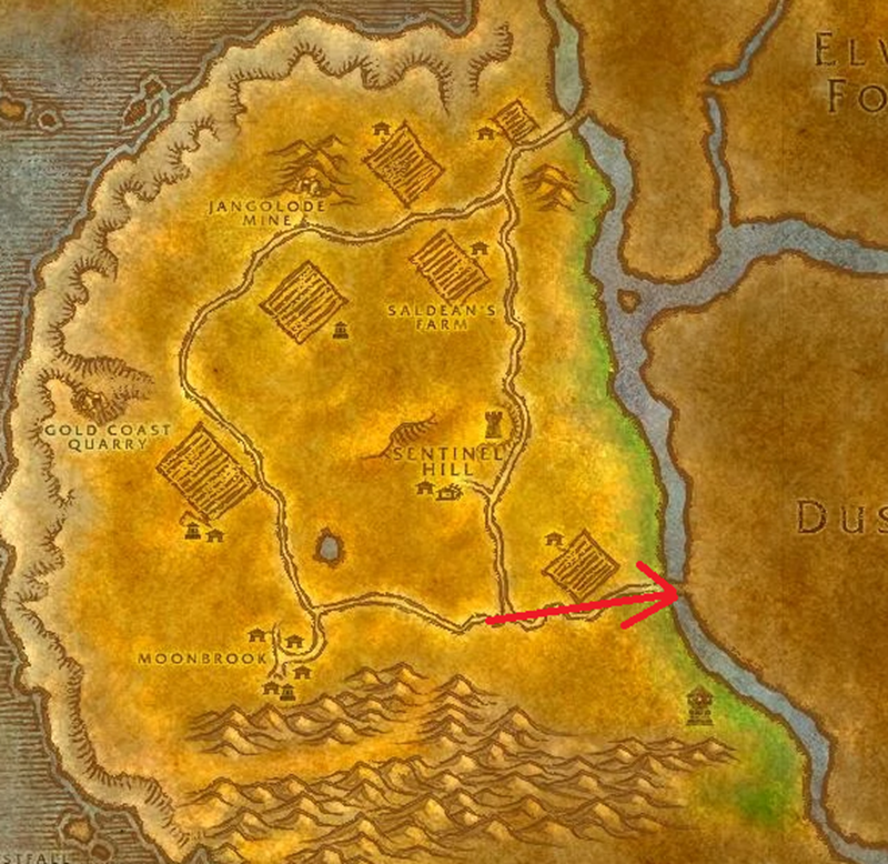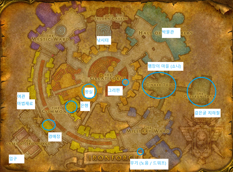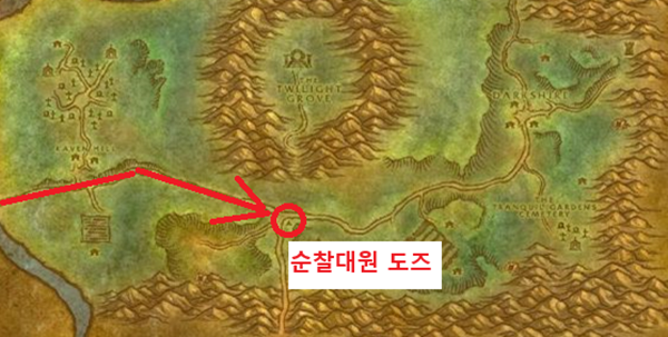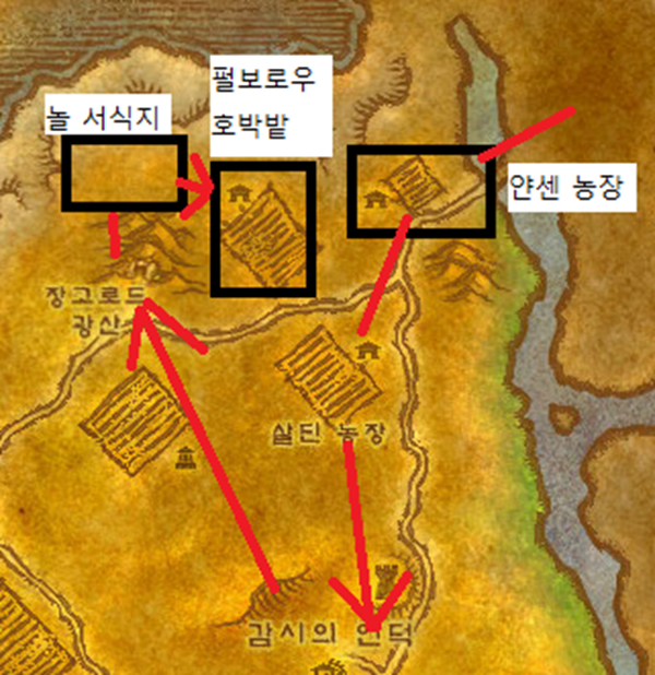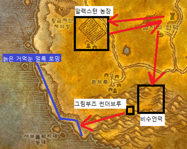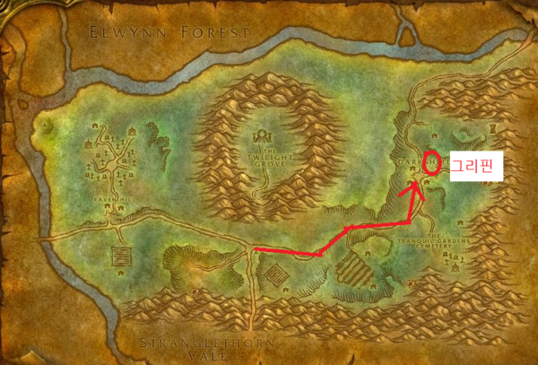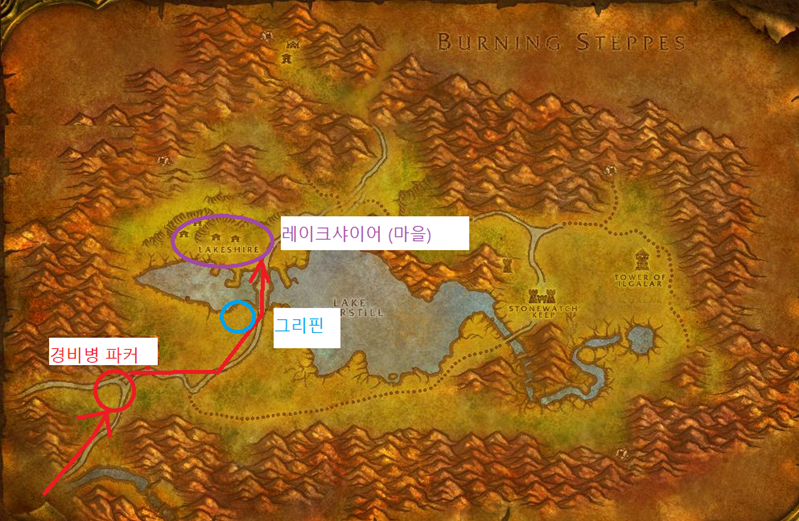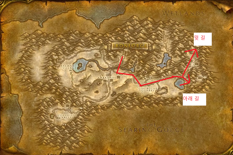 2-4. 나엘/드레나이 (리분)이면 그리핀을 타고 아이언포지를 간 다음 아래 지도를 따라 모단 호수에 간다.