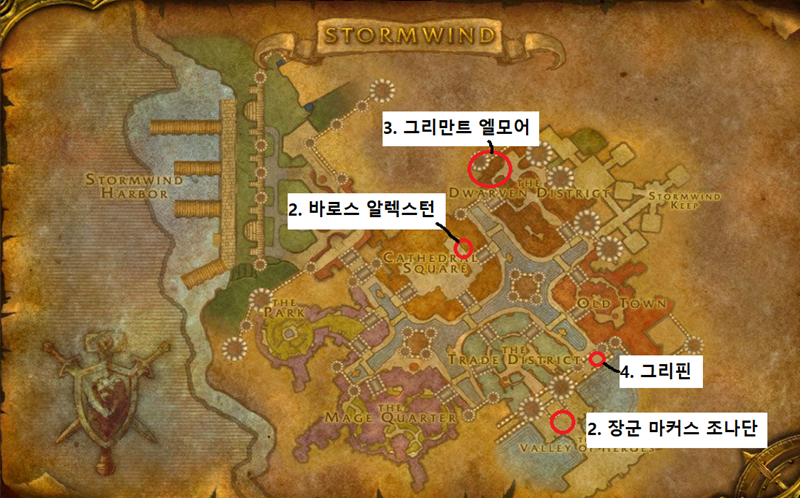 1. 스톰윈드 입구에 있는 장군 마커스 조나단 에게 [스톰윈드로의 전갈을 완료]받고 <<스톰윈드로의 전갈(2)>>를 받는다.