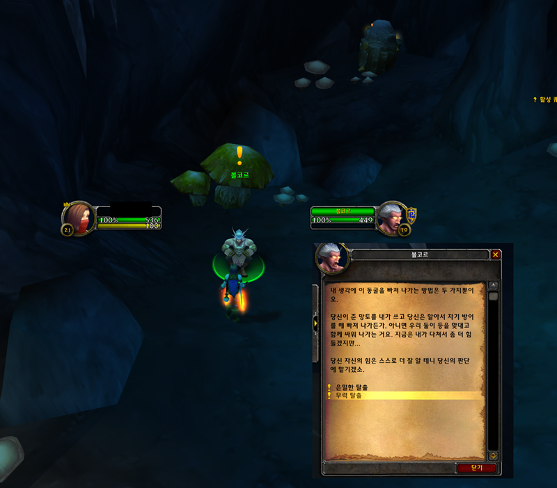 2. 볼코르 에게 이동하여 [사라진 주인(2) 를 완료] 받고 <<은밀한 탈출 or 무력 탈출(호위퀘)>>을 받는다.