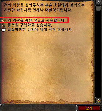 1. 칼바위 언덕 여관에 있는 여관 주인에게 귀환석을 찍고, [일꾼의 짐 / 오르그닐에게 보고 를 완료]받고 다음 퀘를 받는다.