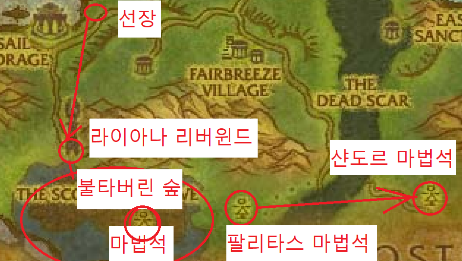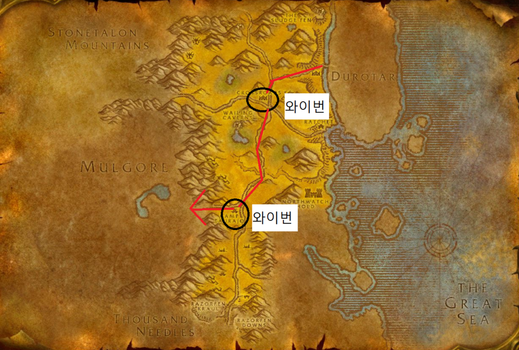 (걸어간다면 크로스로드 / 타우라조 야영지에 들러서 와이번을 꼭 찍자.)