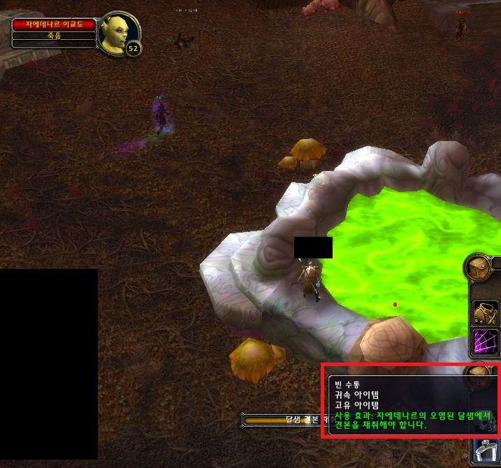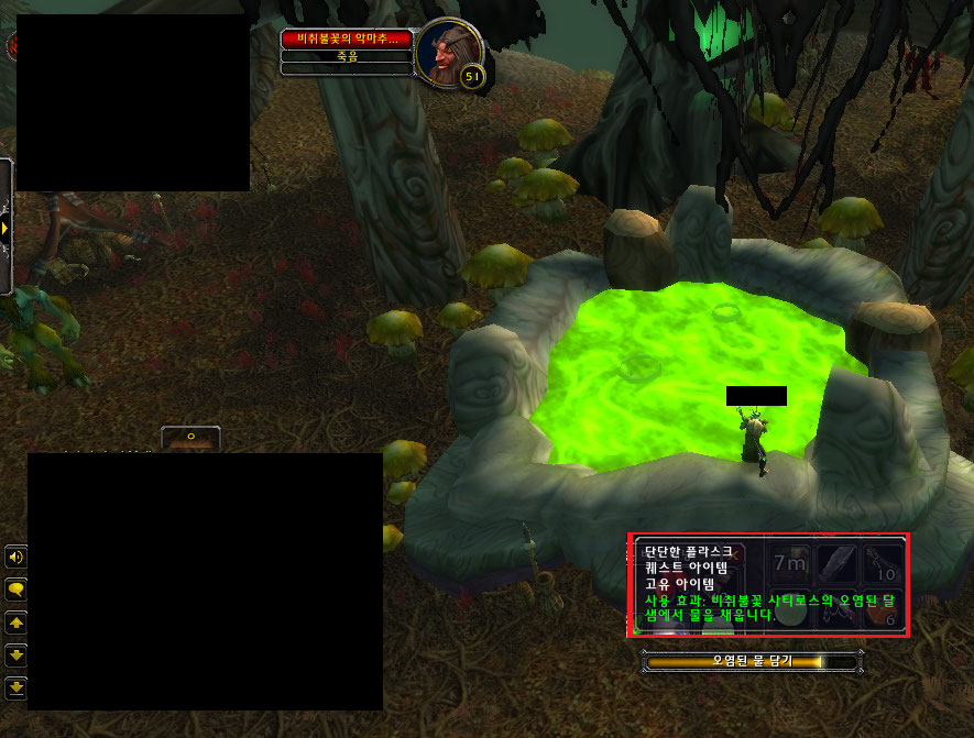 악령발 마을 북서쪽 언덕위에 있는 가마솥을 클릭해서 [타락에 빠지다 를 완료]받고 <<신비한 액체>> 를 받는다.