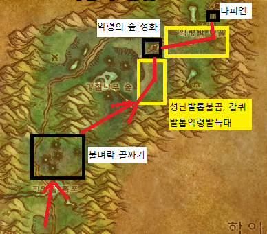 2. 강철나무 굴 방향으로 이동하면서 보이는 성난발톱 불곰, 갈퀴발톱 악령발늑대 를 잡아서 타락의 힘 을 수행한다.