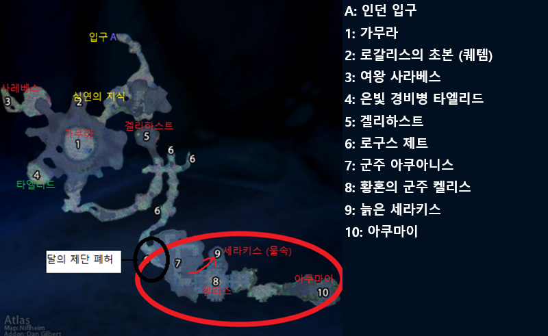 | 검은 심연의 음모 | 은빛경비병 타엘리드 | 인던 내부 가무라 에서 7시 방향 | 18 | 인던 내부에 위치한 NPC | 중립 |
