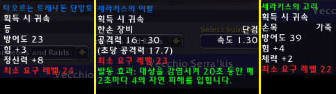 | 정의의 시험 | 정의의 시험 네 개의 재료 중 정화된 코르석을 구할 수 있음. 어둠의 해안 (아우버다인)에 위치한 툰드리스 윈드리버 NPC에게 “코르석 찾기”를 받으면 검은심연의 나락에 있는 나가형 몹이 일정 확률로 부정한 코르석을 드랍하며 이를 윈드리버에게 반납할 시 정화된 코르석 획득. – 인던 입던하기 전에 획득 가능. |